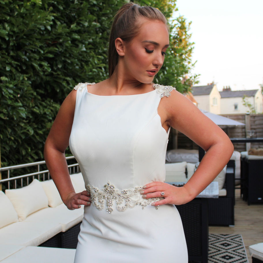 This knockout crepe gown is simplicity from the front - slinky crepe and stunning diamonte belt detail. To the rear of the gown the open illusion back is encrusted with diamontes and is wow! Simple yet striking and guaranteed to wow!