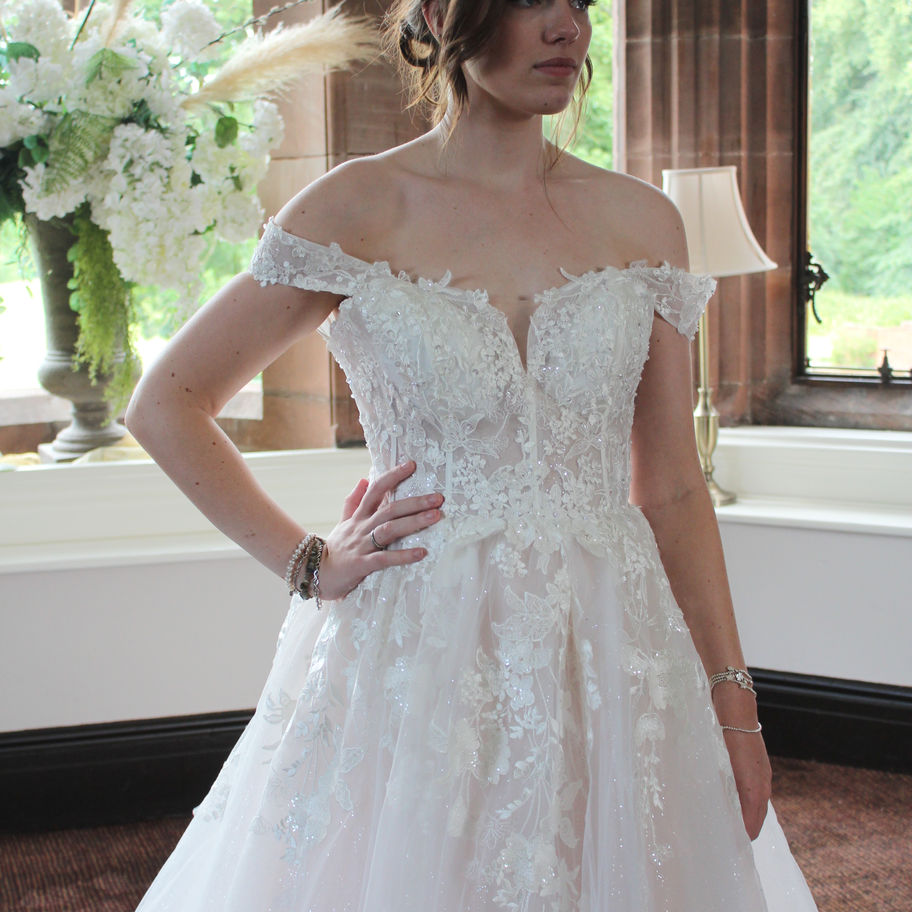Stunning A-Line Bardot style design, with illusion bodice and sparkly tulle skirts . Pretty bardot straps finish the look