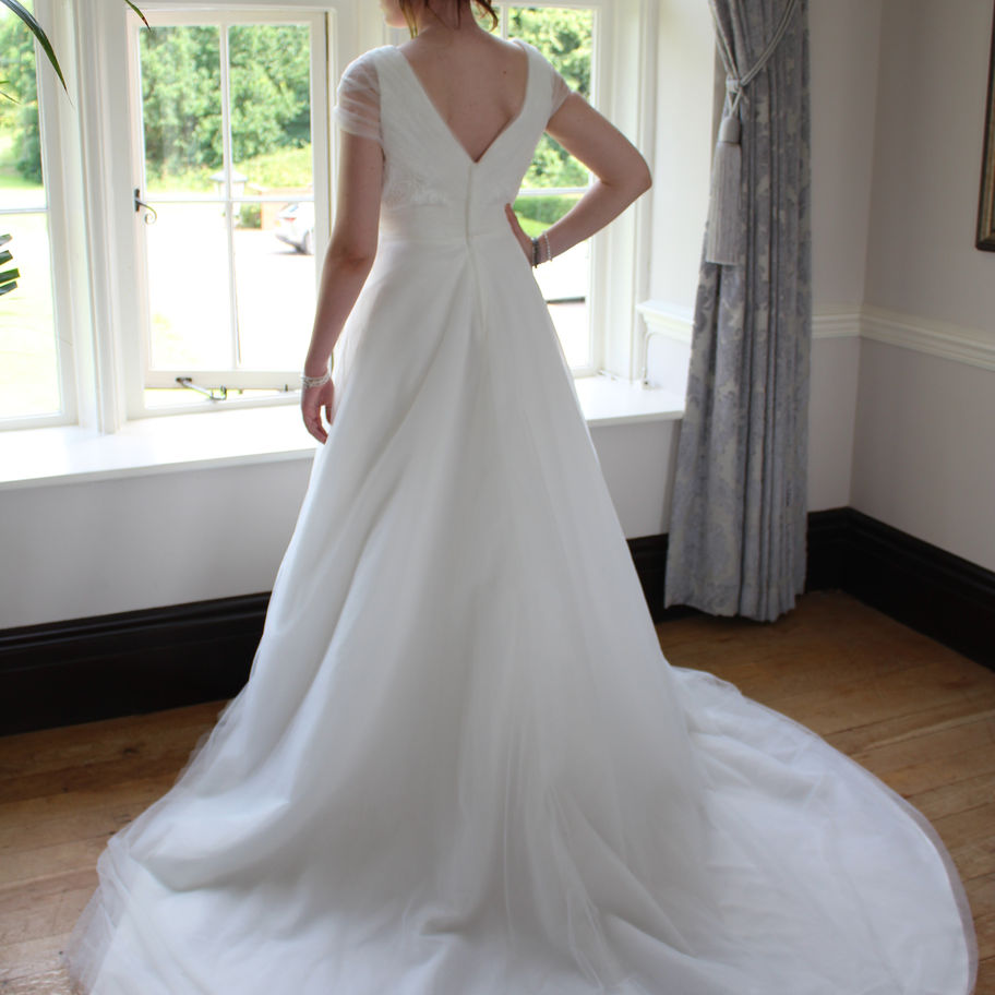 Very pretty traditional gown, with ruched tulle and lace bodice, waistband incorporating a diamonte detail and deep v back. Soft flowing skirts and train in stunning tulle. Finished with tulle cap sleeves - different length sleeves available upon request.