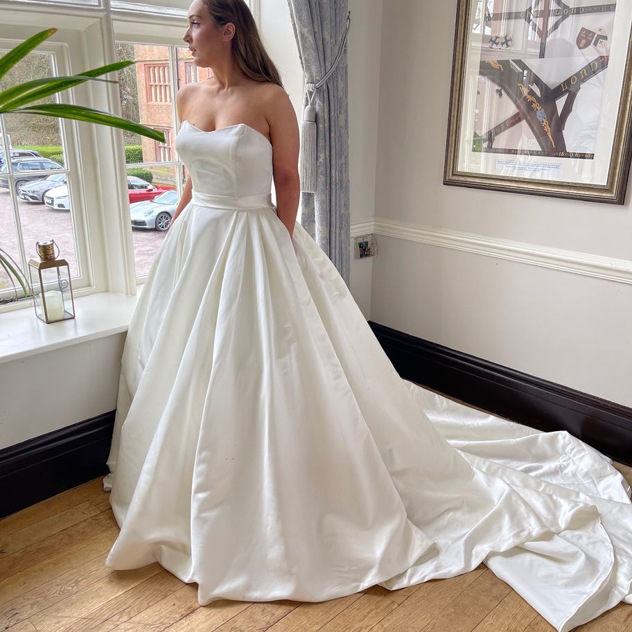 A wow gown! This stunning satin gown is fitted to perfection on the bustline, has a satin belt to the waist and just pleat after pleat of stunning satin for the skirt and train! Hidden extra! Pockets!!! Add a diamonte belt for extra wow! (belt not included).
