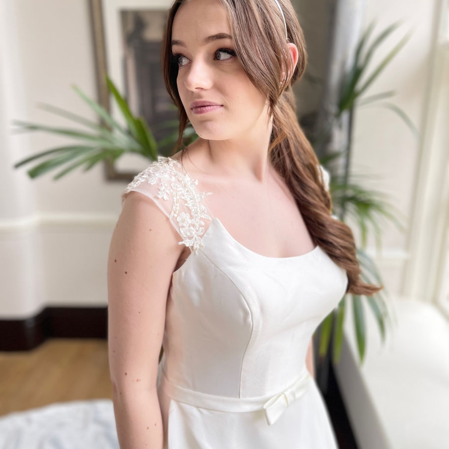 A-Line gown in satin and lace. Beautiful scooped neckline with illusion lace capped sleeves and back detail. Gorgeous belt detail.