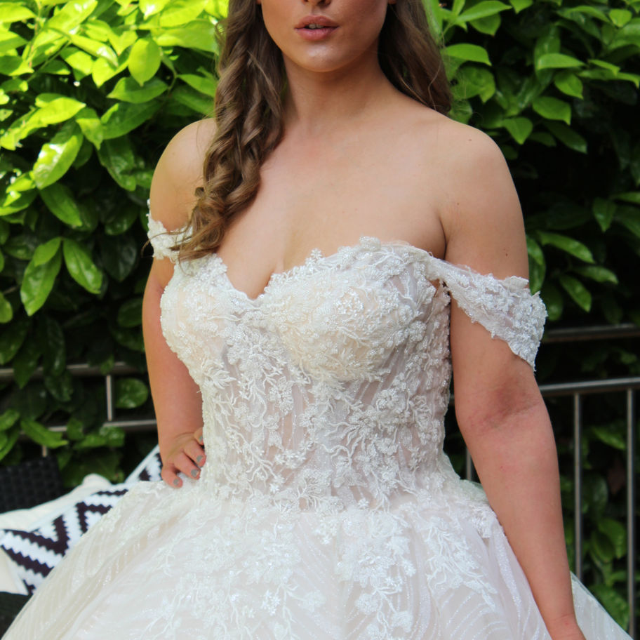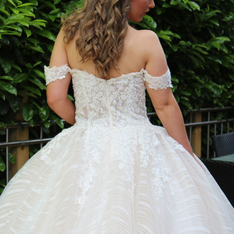 Beautiful Bardot Princess Dress with lace illusion bodice which is heavier at the front for a more demure look. Sparkly tulle skirt edged in matching lace.
