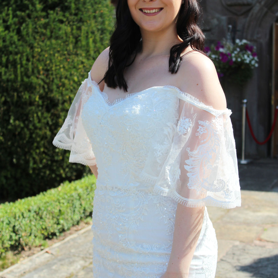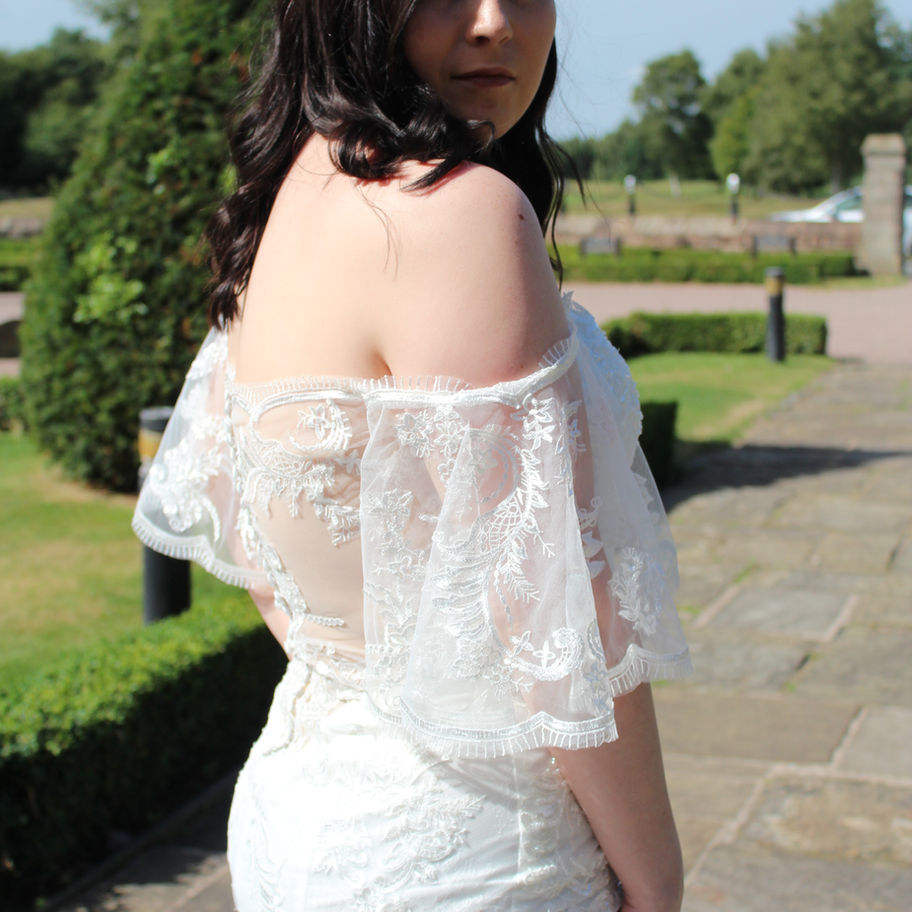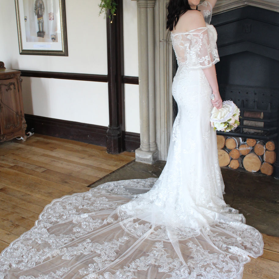 Stunning lace fishtail gown with beautiful open lace illusion back panel and exquisite train. Finished with delicate sleeves that can be worn cap or handkerchief style.