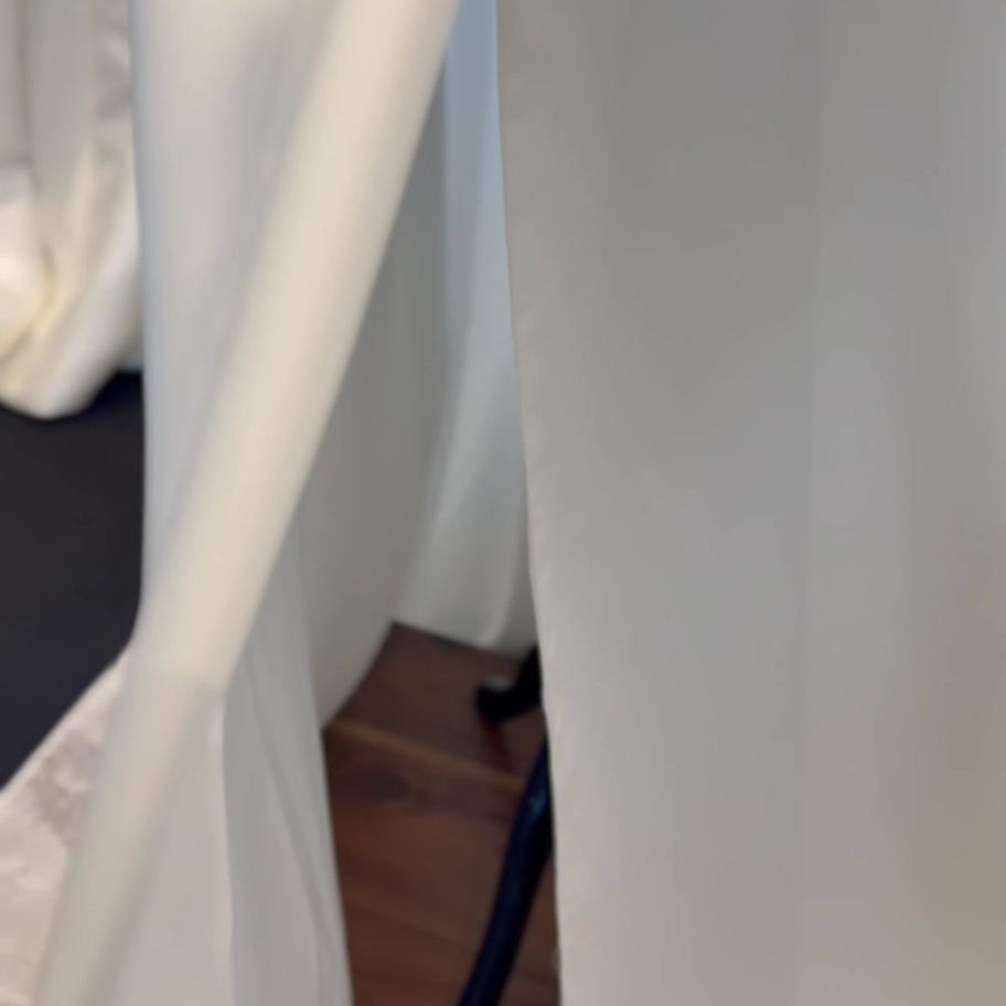 Stunning A line Satin gown with ruched bodice and scooped neckline, with beautiful pleated split skirt. Removable extra wide bardot straps finish the look.